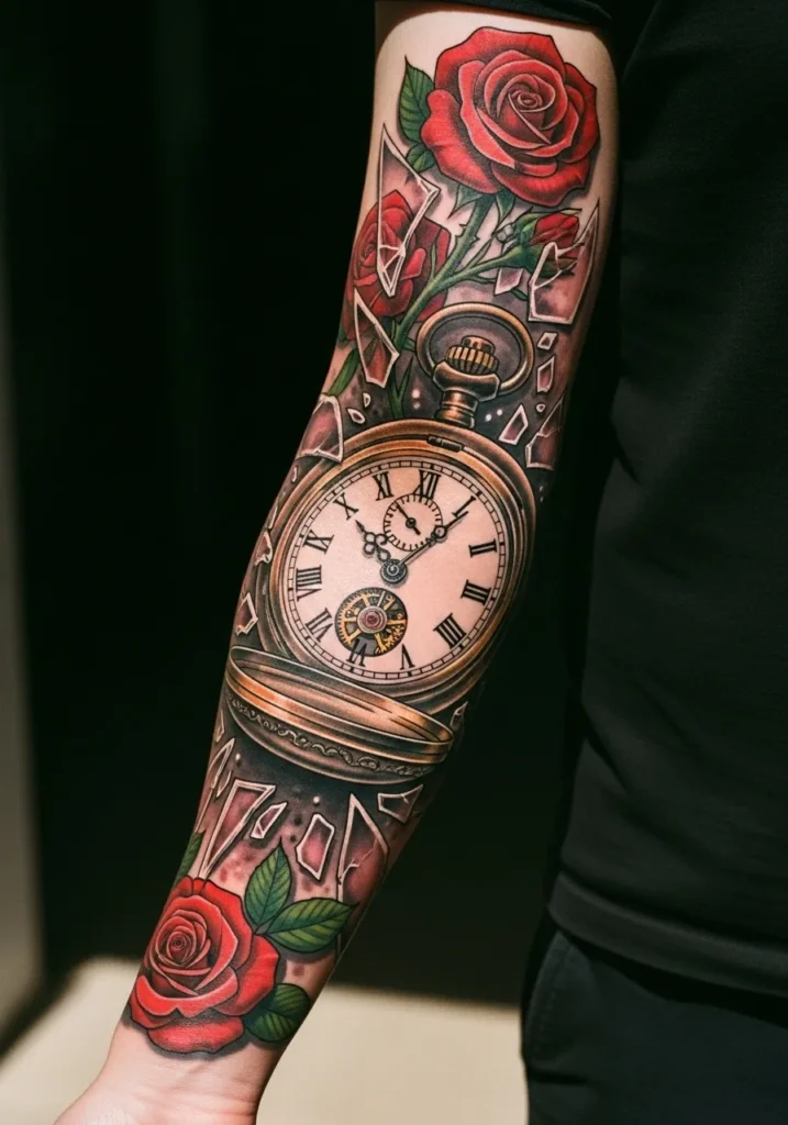 This sleeve combines a vintage pocket watch with deep red roses and shards of broken glass for an intense, symbolic design. The metallic tones of the watch gleam against the skin, while the vivid reds and greens add striking contrast. It s a balanced mix of realism and artistry that flows perfectly down the arm.
