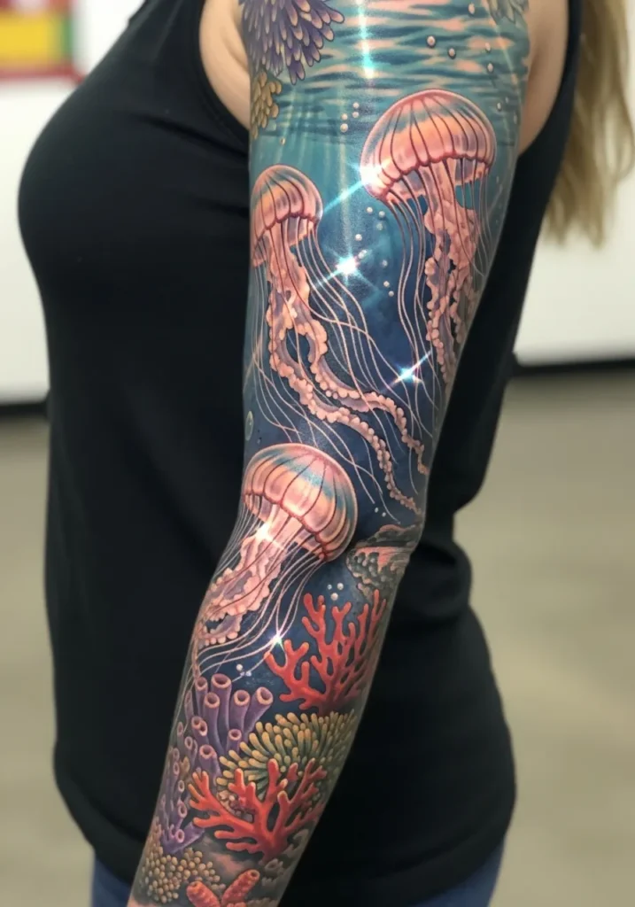 This stunning sleeve immerses the viewer in an underwater dream filled with jellyfish drifting through a glowing coral reef. Shades of blue, pink, and coral shimmer across the arm, capturing the natural rhythm of the sea. Every jellyfish tentacle looks as if it s floating mid-motion under sunlight breaking through the waves.