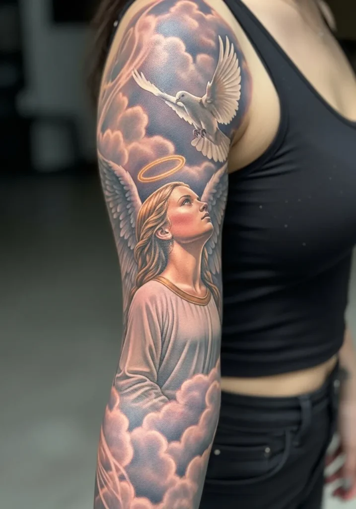 This ethereal sleeve features a beautifully detailed angel gazing upward toward a soaring white dove. Soft pink and violet clouds surround her, and a glowing halo adds a heavenly light effect. The smooth shading and lifelike wings make the entire piece feel full of peace and warmth, flowing gracefully from shoulder to forearm.
