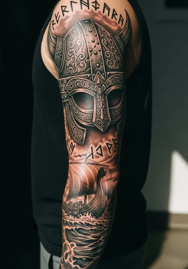 This dramatic sleeve showcases an intricately detailed Viking helmet surrounded by runes, with a longship sailing across stormy seas below. The grayscale tones give it a rugged and ancient look, while the careful shading adds incredible realism. The overall flow connects every element perfectly from shoulder to wrist.
