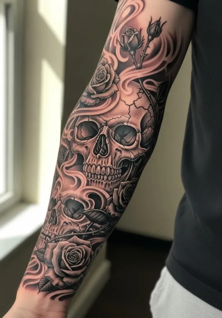 This black and gray sleeve features intricately detailed skulls intertwined with blooming roses and swirling smoke. The contrast between dark shadows and soft highlights creates incredible depth and drama. Every crack in the skull and petal vein feels deliberately placed to tell a story of beauty and mortality.
