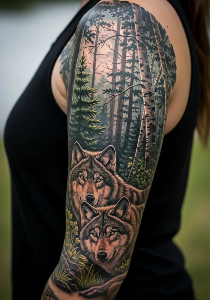 This tattoo brings the wilderness to life with two wolves emerging from a dense forest of pines and birches. The colors feel earthy and natural, with soft shading that makes the fur look touchable. The scene flows gracefully down the arm, like a window into the wild.
