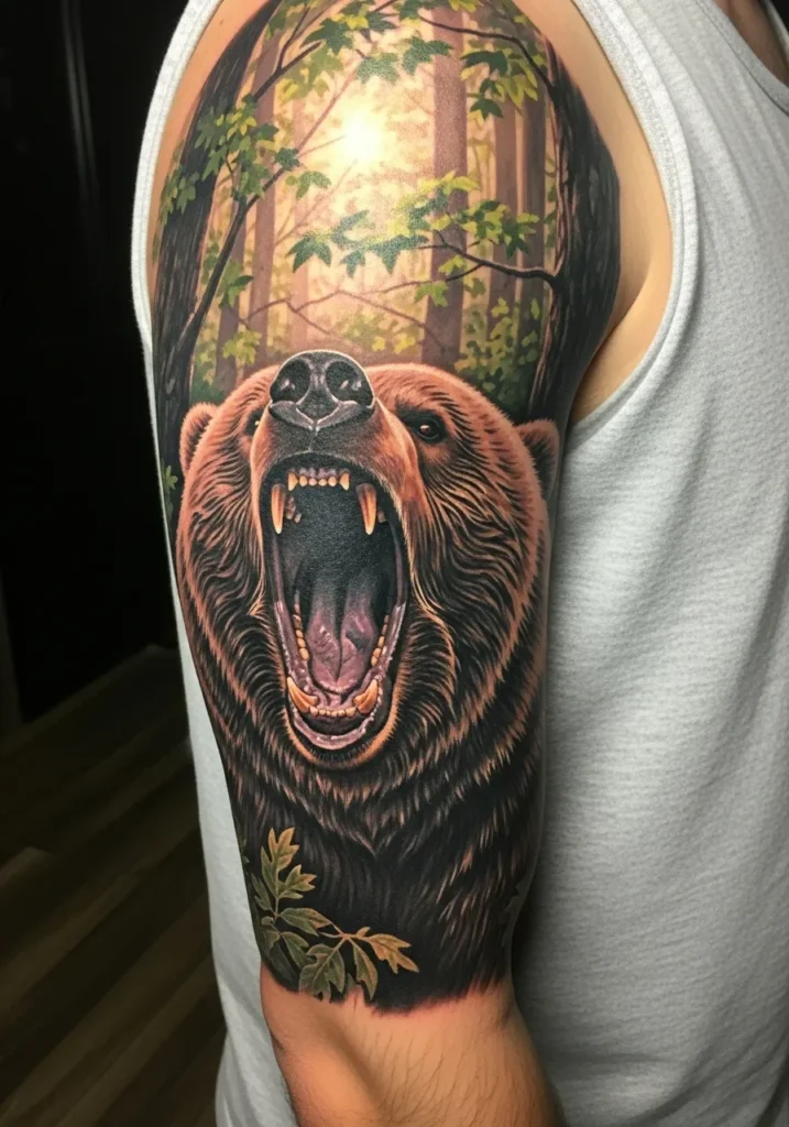 This bold design shows a roaring bear emerging from a lush forest backdrop. The rich browns of its fur and the lifelike depth of its open mouth make it look ready to leap right off the skin. The forest detail wraps naturally around the upper arm, creating a powerful yet harmonious scene.