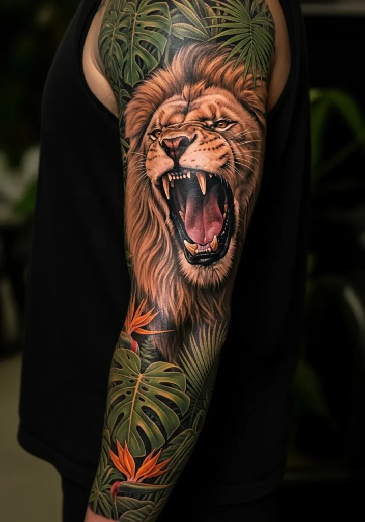 This striking sleeve features a roaring lion surrounded by lush tropical leaves and vibrant bird-of-paradise flowers. The bold greens and oranges create a strong contrast with the lion s golden mane, making it come alive on the skin. The design fills the entire arm with energy and wild beauty.