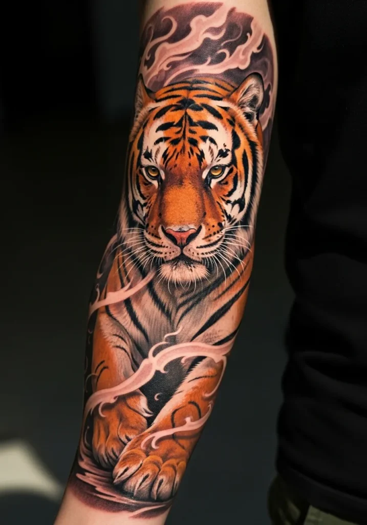 This tattoo showcases a fierce tiger gazing forward, surrounded by swirling smoke and vibrant orange tones. The fur detail is unbelievably realistic, and the shading brings the tiger s power right to the surface. The design fits the forearm perfectly, with the tiger s paws resting naturally near the wrist.