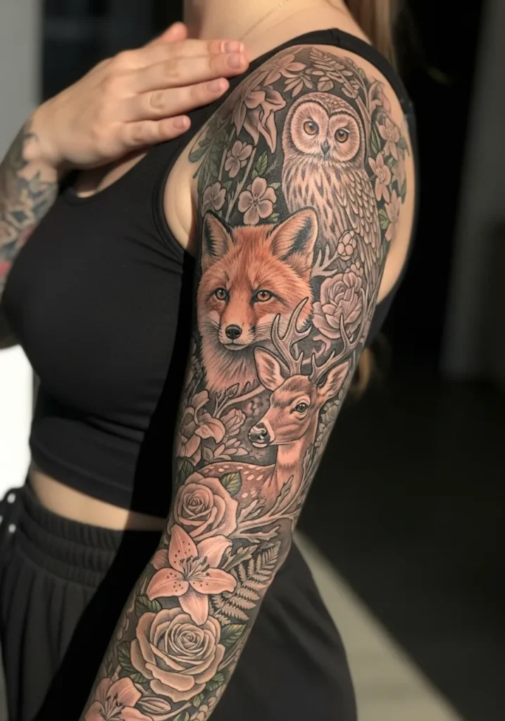 This enchanting sleeve brings together a fox, owl, and deer surrounded by soft florals and leafy details. The natural colors warm browns, muted greens, and gentle pinks create a calming woodland atmosphere. The artist s fine shading and depth make it feel like stepping into a fairytale forest.
