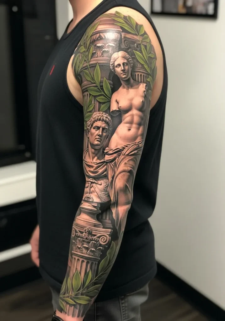 Here, marble statues of classical figures rise among carved pillars and laurel leaves. The grayscale shading makes the stone texture unbelievably real, while the green leaves add just enough contrast to bring warmth. The whole composition wraps elegantly around the arm, creating a museum-worthy effect.