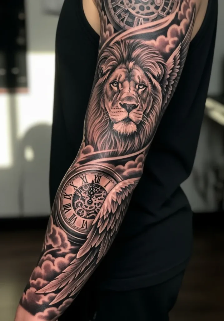 This detailed black and grey sleeve combines a majestic lion s face with angelic wings and vintage clockwork elements. The symmetry and shading are flawless, making the lion appear proud and protective. The timepieces add a layer of meaning, suggesting patience, endurance, and timeless power.