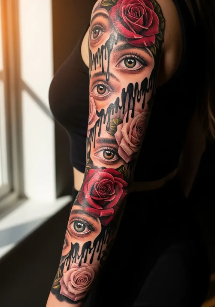 This mesmerizing sleeve mixes hyper-realistic eyes with blooming roses and dripping black ink that melts across the design. The placement is perfect, creating a continuous flow down the arm where each eye seems to watch from between the petals. The contrast between the deep red roses, soft skin tones, and dark dripping paint gives it an unforgettable intensity.