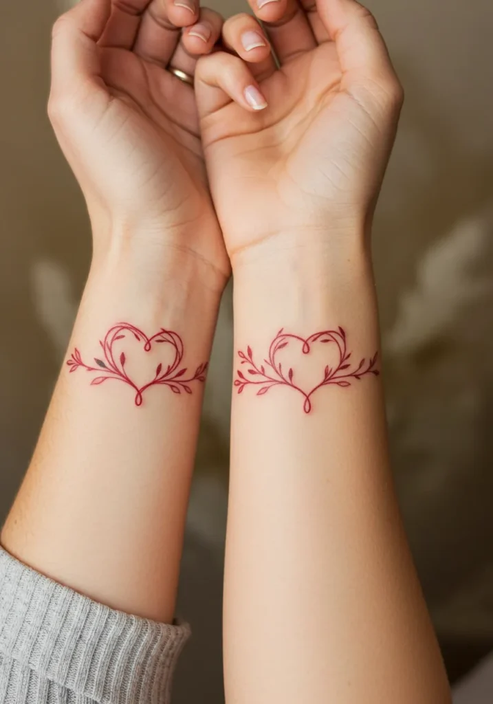 I absolutely love how this design conveys love in such a subtle yet powerful way. The heart, often symbolizing deep connection, is paired with beautiful, organic floral elements that evoke growth and life. The soft red color gives it a soft, feminine touch, while the fine lines make the design feel delicate and modern. It s a perfect representation of the bond between mother and daughter elegant, timeless, and full of meaning. Plus, the symmetry of the design when the arms are side by side makes it even more special. It s a tattoo that speaks to the heart without being too overwhelming, and I think it s absolutely beautiful.
