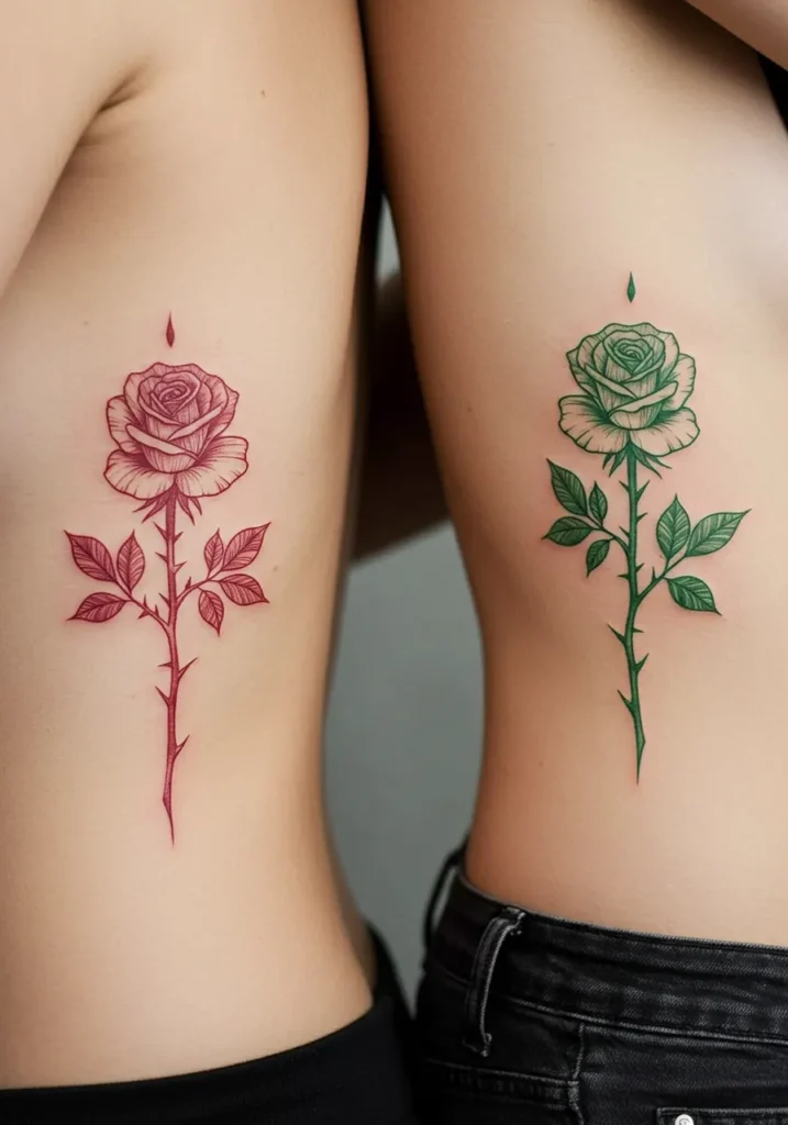 This elegant tattoo design showcases matching rose tattoos for mother and daughter, with each tattoo beautifully done in fine line style. The mother s tattoo features a deep red rose, while the daughter s tattoo is a lush green rose, creating a harmonious balance of color between the two. The roses are meticulously detailed, with fine, delicate lines capturing the essence of the petals and leaves. The design is completed with a small teardrop of color above each rose, adding a subtle yet impactful touch. The placement on the side ribs perfectly aligns the tattoos, symbolizing unity between the two.