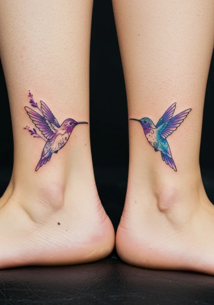 These stunning mother-daughter tattoos feature matching fine line hummingbirds, each colored in soft shades of purple, blue, and turquoise. The birds appear to be flying in opposite directions, with elegant, flowing wings and delicate, intricate details in the feathers. The soft color gradients enhance the graceful and airy feel of the design, while tiny splashes of color around the birds add a whimsical touch. The placement on the ankles allows the tattoos to feel perfectly aligned when the feet are together, emphasizing the shared connection between the two.
