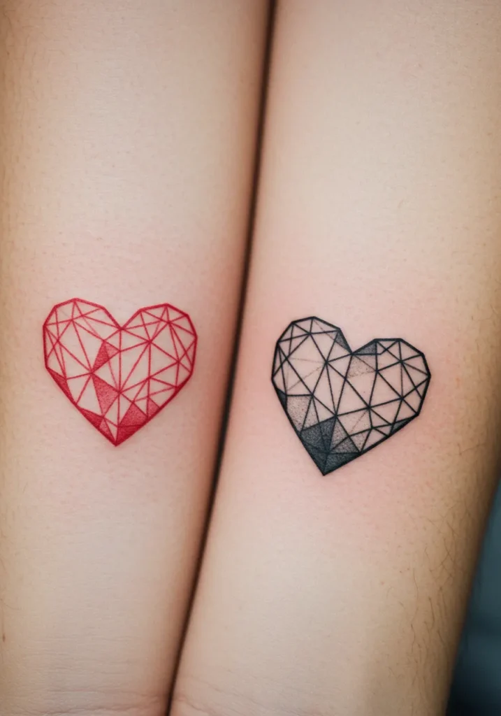 These matching fine line tattoos feature geometric hearts, with the mother s heart done in a rich red color and the daughter s in classic black. The hearts are formed with intricate triangular shapes, giving them a modern, almost faceted look, resembling precious stones. The minimalist design is clean and precise, with each line carefully placed to create a sense of symmetry and balance. These tattoos are placed on the forearms, creating a beautiful mirrored effect when the arms are side by side, perfectly showcasing the special connection between mother and daughter.