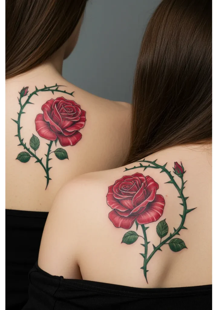 This stunning set of mother-daughter tattoos features beautifully detailed fine line roses, with vibrant red petals and green leaves. The roses are placed symmetrically across the upper back, connected by a thin green vine that wraps gently around each shoulder. The thorns add an edgy contrast to the softness of the roses, giving the design a bold yet delicate touch. The shading and coloring bring the roses to life, making them stand out against the skin with their vibrant hues and intricate details.