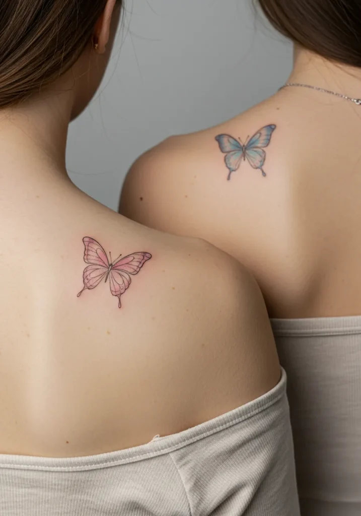 These delicate butterfly tattoos are a stunning symbol of transformation, freedom, and beauty. Each tattoo features a simple but expressive butterfly design with fine lines, accented with soft pastel colors, such as pinks and blues. The wings are beautifully detailed, and the minimalistic nature of the design enhances its elegance. The placement on the upper back adds a personal touch, making these tattoos both a work of art and a meaningful connection between mother and daughter.