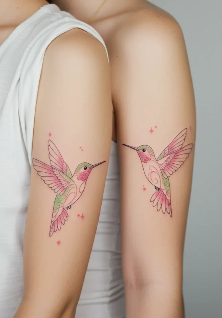 These hummingbird tattoos are both delicate and deeply meaningful, capturing the essence of freedom and grace. Each tattoo features a finely detailed hummingbird, with pastel hues of pink and green blending into soft gradients on the wings. The design also incorporates small touches of stars and swirling patterns that give the tattoos a whimsical, ethereal feel. Positioned on the upper arm, these tattoos are an elegant and symbolic representation of the unique bond shared between mother and daughter.