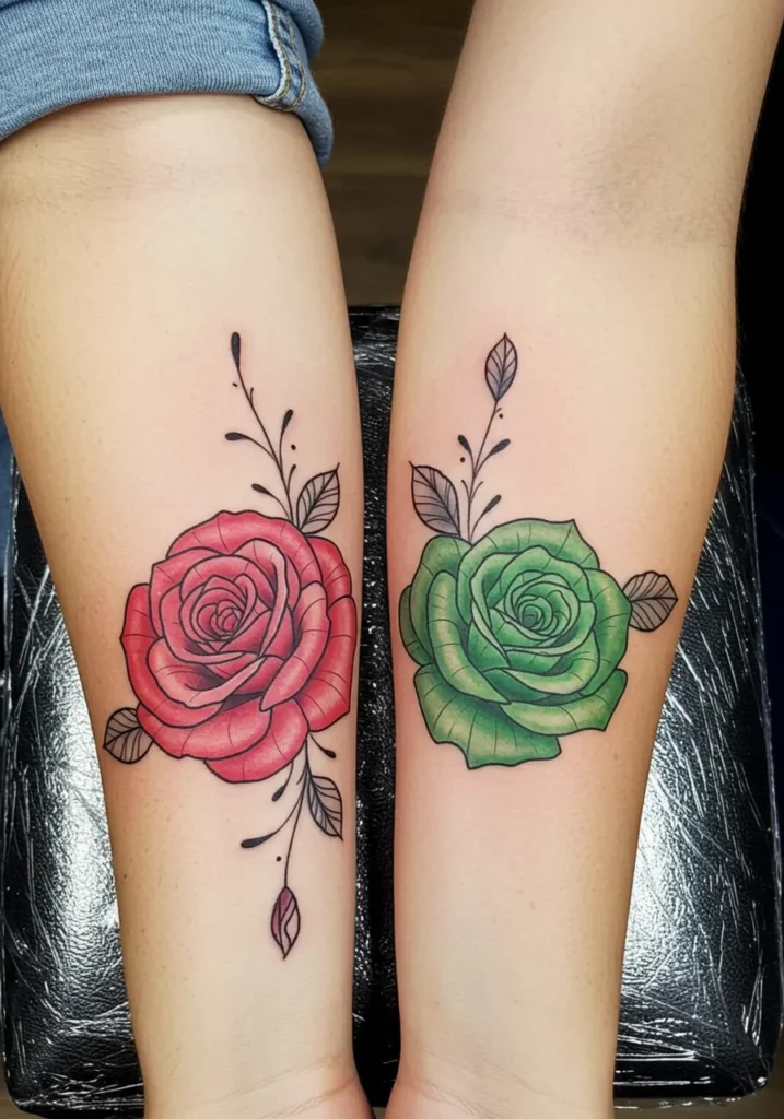 I absolutely adore how these tattoos blend elegance with meaning. The red rose represents love and passion, while the green rose can symbolize growth and renewal. Together, they form a beautiful representation of the mother-daughter relationship full of love, growth, and connection. The fine line work keeps the design delicate and timeless, while the soft pops of color bring it to life without overpowering the natural beauty of the roses. It s a perfect tattoo pairing for anyone looking to express both the depth of their bond and their shared journey through life.