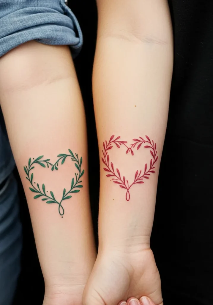 These elegant tattoos feature a heart shape delicately crafted from intertwined leaves, one tattoo in a deep, lush green and the other in a vibrant red. The fine line work creates an intricate, graceful design with each leaf and curve of the heart standing out. The symmetrical pairing of the two tattoos represents a perfect connection between the mother and daughter, subtly reflecting their unique bond with the different but complementary colors.
