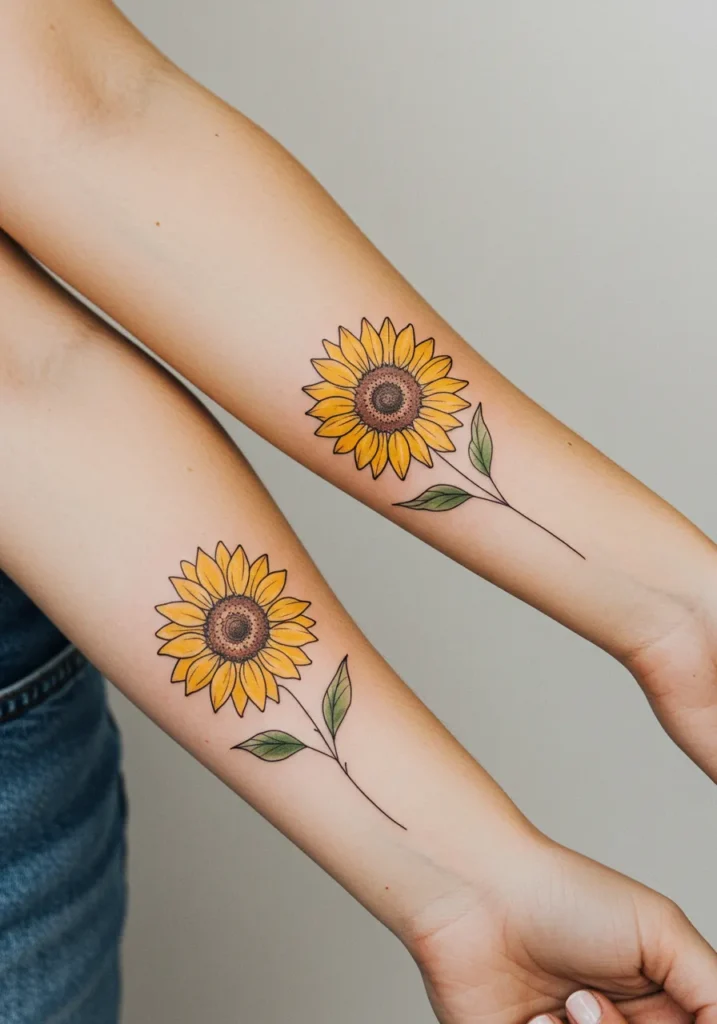 What makes these sunflowers so special is how they symbolize positivity, growth, and warmth qualities that make a mother-daughter bond so unique. The fine line work gives the flowers a light, elegant touch, while the splash of yellow adds just the right amount of vibrancy to make the tattoos pop. I love how the design feels fresh and full of life, making it a beautiful reminder of the strong, blooming connection between mother and daughter. It s one of those tattoos that feels timeless, yet incredibly personal, capturing the essence of a shared journey with style and grace.