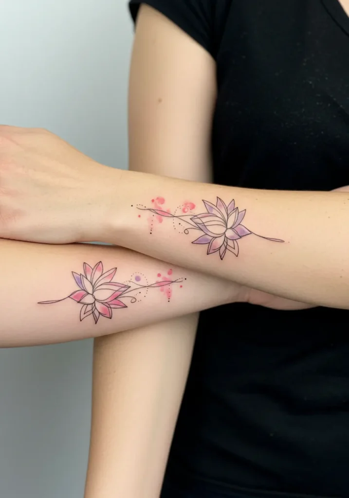 These matching fine line tattoos feature a delicate lotus flower design for both mother and daughter. The flowers are outlined in thin black lines, with soft watercolor-style gradients of pink and purple that add a gentle, ethereal vibe to the design. The blossoms are connected by a fine line stem, and small dots of color create a whimsical trail leading from the flowers. The tattoos are placed on the forearms, making them a beautiful mirrored design when the arms are side by side.
