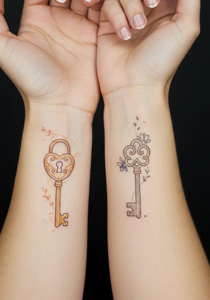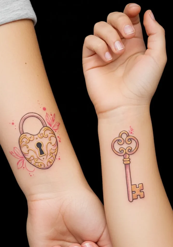 What makes these tattoos so special is the beautiful symbolism they hold lock and key are timeless symbols of love, trust, and protection. I absolutely love how these designs mirror each other, with the mother and daughter playing a complementary role. The fine line style keeps the tattoos delicate and subtle, while the warm colors bring them to life in a way that feels soft yet vibrant. This tattoo perfectly represents the deep connection and mutual care between mother and daughter, and it s a design that feels both meaningful and charming.