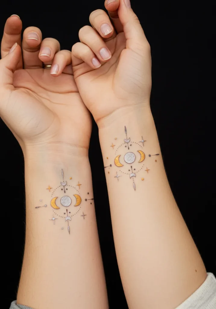 What I absolutely love about these tattoos is how they blend the beauty of the cosmos with personal meaning. The moon has long been a symbol of femininity, cycles, and renewal, which makes it an especially meaningful choice for a mother-daughter tattoo. The gentle watercolor accents, paired with the fine line detailing, make this design feel soft, yet powerful. It s understated, yet full of meaning, and is a beautiful way to carry a shared bond under the stars! It s one of those tattoos that can be timeless, delicate, and profound all at once.