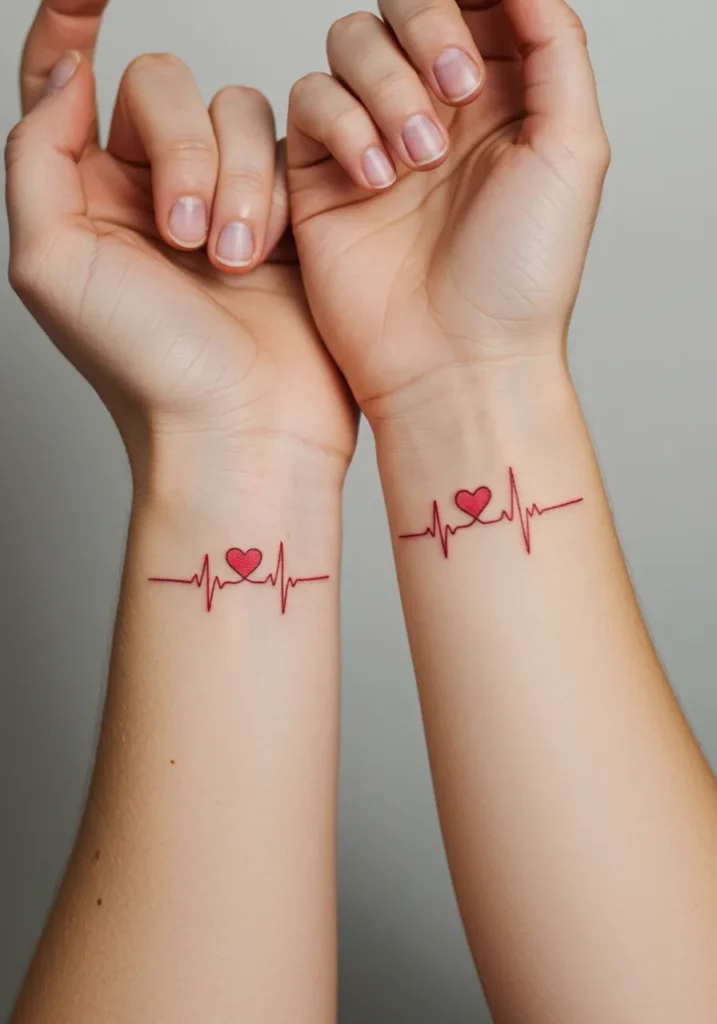 I love how these tattoos are a beautiful representation of love and connection between mother and daughter. The heartbeat line symbolizes life, rhythm, and the constant flow of emotions, while the heart in the center adds a personal and loving touch. The minimalist design feels elegant and fresh, yet the red color gives the tattoos a bold, emotional depth that makes them stand out. It s the perfect combination of subtlety and meaning making it a beautiful tribute to a bond that s truly irreplaceable.