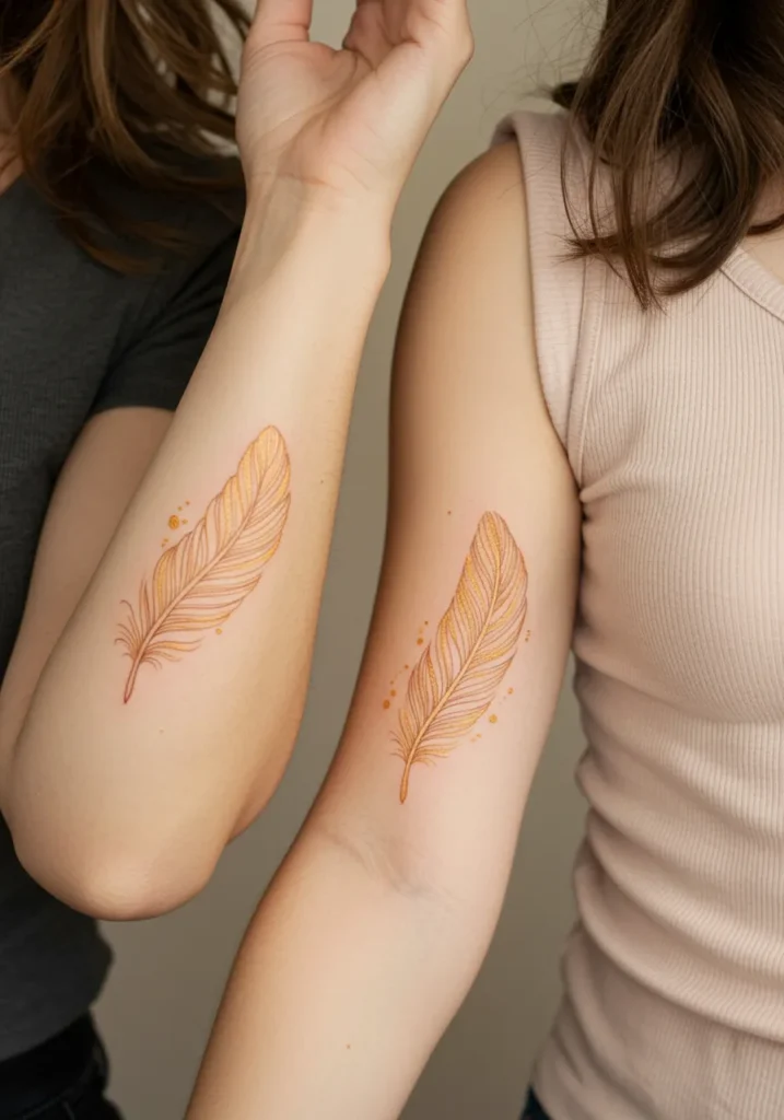 This elegant tattoo design features matching fine line feathers, drawn with soft, delicate strokes that create a light and airy look. The feathers are colored in soft golden tones, creating a gentle and warm feel. Each feather is beautifully detailed, with intricate lines and small dots that enhance the texture and depth of the design. The placement on the forearm makes the tattoos both subtle and striking, with each feather flowing downwards, creating a sense of balance and symmetry between the mother and daughter.