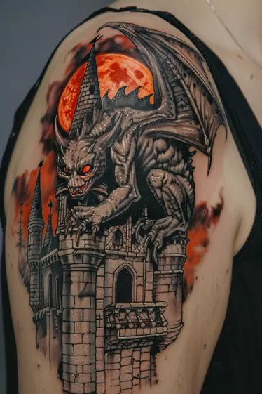 This tattoo captures the eerie beauty of medieval gothic architecture, featuring a terrifying stone gargoyle perched atop a castle tower. The intense red glow of the full moon in the background gives it a haunting, dramatic energy, casting an ominous light over the entire design. The detailed stone texture of the castle adds depth, making it feel like this creature has stood guard over the fortress for centuries. The glowing red eyes and tensed claws give the gargoyle a menacing, alive presence, as if it s about to leap from the skin.