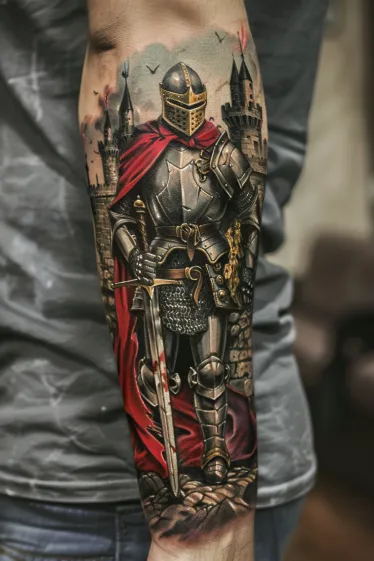 This incredibly detailed knight tattoo brings medieval legend to life. The fully armored warrior stands tall, gripping a battle-worn sword with both hands. His golden helmet visor gleams, adding a regal touch to the steel-plated armor, which is accentuated with intricate engravings. A deep red cape flows behind him, complementing the shadowed castle towers in the background. The small flocks of birds circling the fortress add an eerie, dramatic touch, making the entire piece feel like a scene from a historical epic.