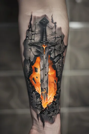 This one is just pure power and drama. The cracked stone effect makes it feel like something straight out of an ancient prophecy, and that glow from the flames? Absolutely unreal. There s something so badass yet elegant about a sword tattoo, and this one nails the balance between strength and mystery. If you want a tattoo that looks like it was forged in fire and legend, this is the one.