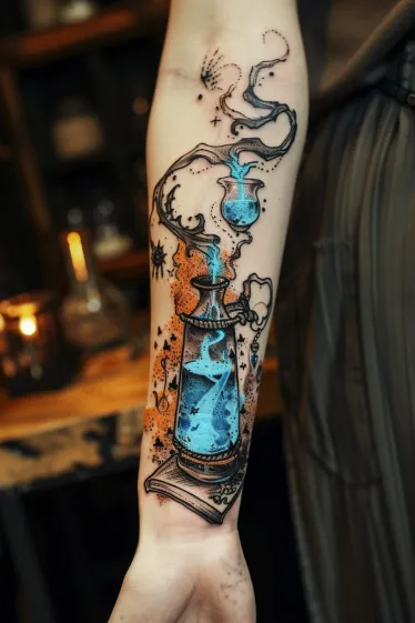 This tattoo is pure magic, featuring an ornate glass potion bottle bubbling with a glowing blue elixir. The floating vial above it spills liquid into the main flask, while wisps of enchanted smoke swirl into the air, creating a dreamy and mystical effect. The fine line details make the design feel straight out of a medieval alchemist s lab, with celestial symbols and golden splashes adding a touch of ancient mystery. The contrast between the deep blues and warm background tones makes the whole design feel like it s alive with energy.
