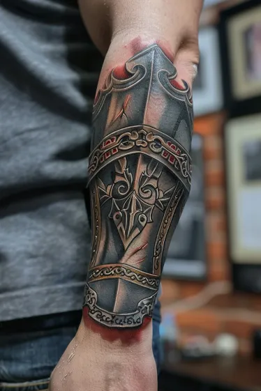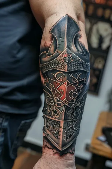 This tattoo transforms the forearm into a masterpiece of medieval craftsmanship, featuring an intricately detailed armor plate with engraved patterns. The dark steel plating, highlighted with fine silver detailing and Celtic-inspired filigree, gives it a regal, battle-ready presence. The deep red shading beneath the armor creates an illusion of the metal being fused to the skin, making it feel like part of the wearer s own body. The weathered edges, rivets, and textured plating add a sense of history and resilience, as if this armor has seen countless battles.