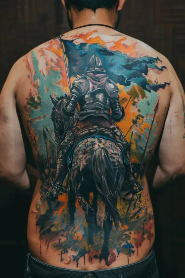 This tattoo is pure medieval glory, showing a fully armored knight riding into battle on a warhorse covered in steel plating. The black battle flag waves in the wind, adding a sense of motion and intensity. The splashes of orange, blue, and yellow in the background create a dramatic, almost painterly effect, making it look like this knight is charging straight out of history and onto the skin. Every detail, from the textured armor to the war-torn banner, adds to the raw, battle-hardened energy of this piece.