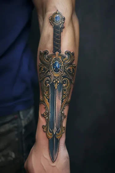 This tattoo turns the forearm into a legendary artifact, featuring a majestic medieval sword with intricate gold filigree and embedded gemstones. The rich blue and gold hues create a regal, almost enchanted look, making it feel like a weapon fit for a knight or a noble warrior. The decorative engravings on the hilt and guard add an old-world charm, while the precise shading gives it a three-dimensional effect, as if the sword is resting just beneath the skin.