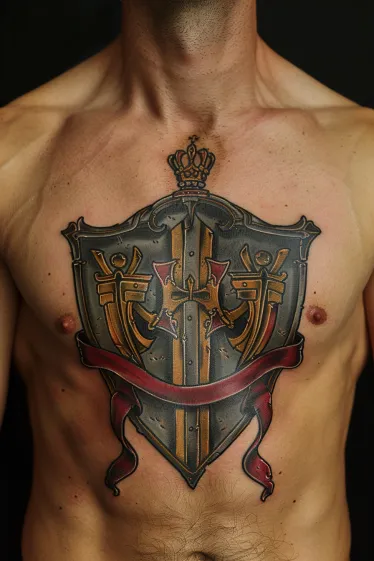 This tattoo is the definition of medieval nobility, with a grand, battle-worn shield covering the chest like a knight s coat of arms. The gold and steel plating gives it a regal feel, while the deep red banners and crowned top add a powerful touch of royalty. The centered sword piercing through the crest makes the whole piece look like an emblem of honor, strength, and legacy. The intricate detailing and metallic shading create a lifelike effect, making it seem as if the shield is truly forged into the skin.