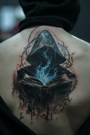 This tattoo radiates pure dark magic, featuring a cloaked sorcerer with an open grimoire crackling with arcane energy. The deep black hood conceals the figure s face, adding an eerie sense of mystery, while blue lightning surges from the enchanted book, illuminating the design with an ethereal glow. Delicate wisps of ancient script and swirling magical energy surround the composition, making it feel like a scene from a forbidden medieval spellbook. The contrast between shadowy blacks and electric blues creates an otherworldly, supernatural effect.