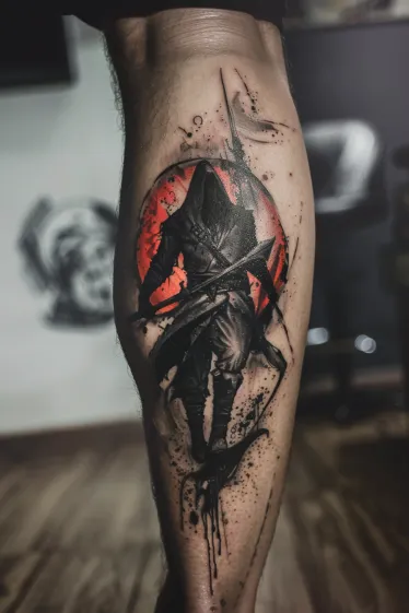 This tattoo captures pure mystery and danger with its dark, shadowy assassin standing against a fiery red moon. The black ink splashes and rough brush strokes give the whole piece a chaotic, battle-worn feel, almost like it s been painted straight onto the skin. The assassin s hooded cloak, twin daggers, and battle-ready stance add a sense of motion, making it look like they re about to strike. The deep reds and stark blacks create an intense contrast, pulling the eye right to the center of the action.