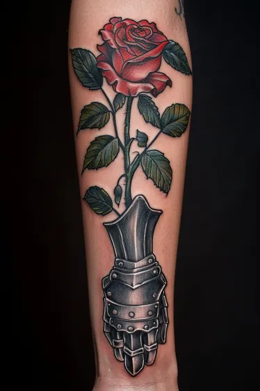 This tattoo blends strength and beauty in a way that feels straight out of a medieval romance. The detailed metal gauntlet serves as the base, grasping the stem of a lush red rose with deep green leaves. The contrast between the cold, hard steel and the soft, delicate petals makes this design incredibly symbolic. The shading and highlights give the gauntlet a polished, three-dimensional effect, while the rose has a classic, almost old-school tattoo feel.