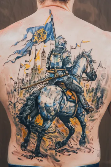 This one is incredibly powerful. The way the knight commands the scene, with his pristine armor and flowing banner, gives it such a heroic and cinematic feel. I love how the motion of the horse and the sweeping flags make the entire tattoo feel alive, like a battle moment frozen in time. If you love knightly valor, history, and tattoos that tell a grand story, this one is absolutely breathtaking.