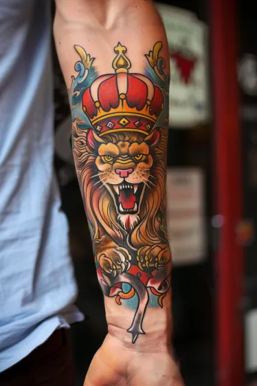 This majestic lion tattoo looks straight out of a medieval coat of arms. The deep golden mane flows with fierce energy, framing the lion s piercing eyes and snarling mouth. A bold red and gold crown sits proudly on its head, giving the whole design a royal and powerful presence. Surrounding blue and gold flourishes add an extra level of richness, while the sharp, metallic details at the bottom bring in a touch of medieval weaponry. The bold linework and vibrant color palette make this an absolute statement piece.