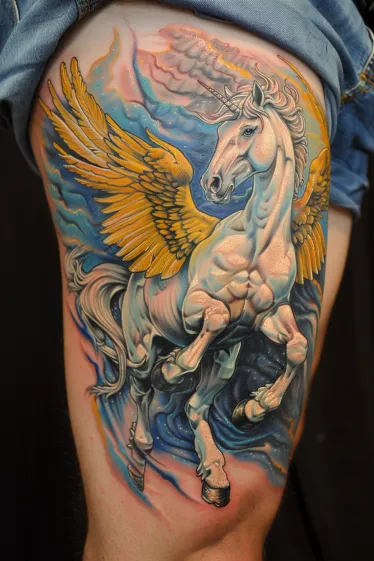 This breathtaking Pegasus tattoo is pure medieval fantasy. The muscular white stallion rears up with golden wings fully spread, glowing against a swirling sky of blue and pink clouds. A shimmering horn on its forehead adds an extra touch of enchantment, blending unicorn magic with celestial power. The shading and highlights create a three-dimensional effect, making the Pegasus appear as if it s about to take flight right off the skin.