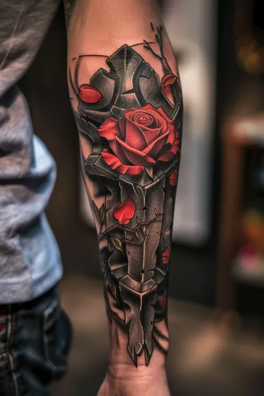 This one is pure medieval poetry. The way the rose stands out against the dark metallic elements makes it feel symbolic and dramatic, like something out of a legendary tale. I love how the deep reds pop so vibrantly, making the whole design feel both fierce and beautifully delicate at the same time. If you re drawn to tattoos that mix knighthood, passion, and timeless beauty, this one is absolutely unforgettable.