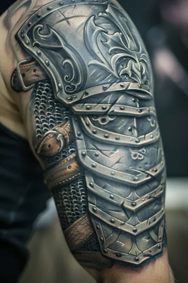 This tattoo transforms the shoulder into a medieval masterpiece, featuring intricately layered plate armor with chainmail peeking through the gaps. The metallic sheen and fine engravings make it look like a real piece of battle-worn armor, while the rivets, straps, and embossed floral detailing add an extra level of craftsmanship. The realistic shading and highlights give it a three-dimensional look, making it seem as though the skin itself has been forged into steel.