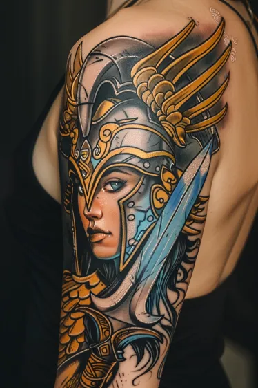 This tattoo is a bold and powerful depiction of a Valkyrie, the legendary warrior maiden from Norse mythology. The intricate gold and silver helmet features ornate winged detailing, giving the design an unmistakable regal presence. Her gaze is intense and determined, framed by flowing dark hair, while the blue steel sword she holds adds a striking contrast to the warm metallic tones. Every element, from the finely shaded armor to the golden feather accents, creates a stunning blend of realism and neo-traditional artistry.