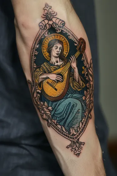 This tattoo feels like it was plucked straight from an illuminated manuscript, featuring a medieval bard serenading with a lute. The golden halo and intricate frame give it a sacred, timeless elegance, while the muted blues, greens, and warm gold tones create an authentic vintage look. The fine line details and delicate shading make this piece look like a hand-painted fresco, giving it a truly historic feel. The ornate border adds a touch of nobility, making the whole design feel like a precious artifact from the past.