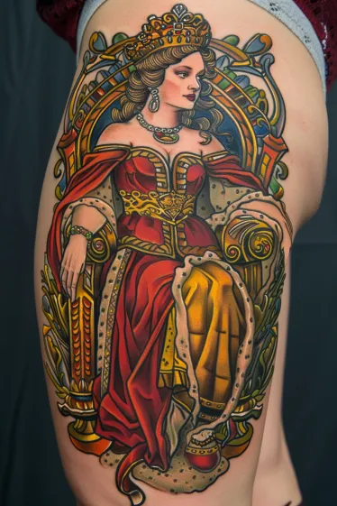 This stunning tattoo of a medieval queen is pure royalty. Seated on an ornate golden throne, she wears a deep red gown with gold embroidery that flows elegantly around her. The fur-lined cloak drapes over the chair, adding a regal touch, while her bejeweled crown and intricate jewelry make her look powerful and refined. The bold outlines and rich colors give this tattoo a classic, almost stained-glass window effect, making it feel like a piece of medieval art brought to life.