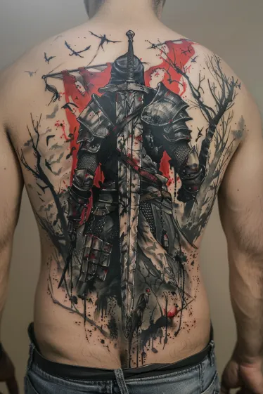 This tattoo is a powerful tribute to medieval chivalry, featuring a fully armored knight standing tall with a massive broadsword planted into the ground. The polished steel armor glows with depth and detail, while the deep red cape flows behind him, adding a dramatic contrast. The subtle blood splatters and weathered edges give the impression of a warrior who has seen battle, yet remains steadfast and unshaken. The design melts into the skin, almost as if the knight is emerging from another time.