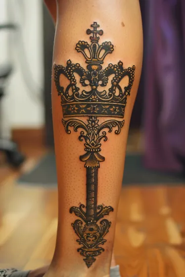 This tattoo is the perfect mix of royalty and power, featuring a highly detailed crown fused seamlessly with an ornate sword. The deep black and golden shading makes the design feel almost like a piece of medieval jewelry. The intricate filigree work on both the crown and sword handle adds an elegant, vintage feel, while the long, vertical placement on the leg makes it look like a royal emblem straight from history.