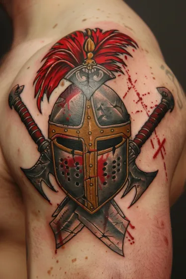 This tattoo is bold, battle-worn, and packed with medieval energy. A steel-plated knight s helmet, complete with a regal gold trim and a striking red plume, takes center stage. Behind it, two massive battle axes cross over blood-stained armor plates, creating a powerful symbol of war and honor. The deep reds and sharp metallic shading make every detail pop, giving the design a realistic and three-dimensional feel. The scattered blood splatters add a raw, battle-scarred touch, making it look like this armor has seen the front lines.